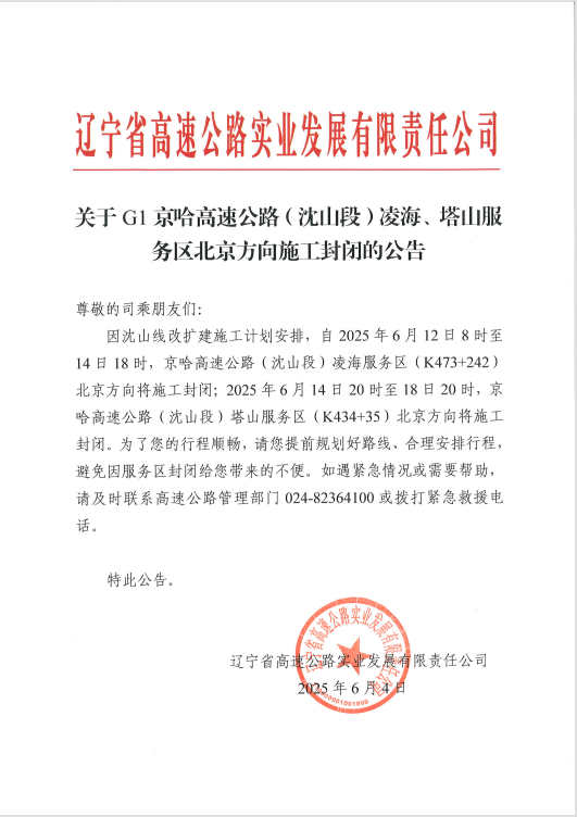 關(guān)于G1京哈高速公路(沈山段)凌海、塔山服務(wù)區(qū)北京方向施工封閉的公告